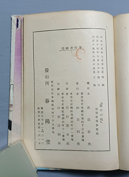 前の商品 次の商品 竹久夢二 木版装丁 長田幹彦『霧の小唄』 大正15年 春陽堂 希少本【送料無料】 ¥22,000 商品名 :『霧の小唄』 著 者 :長田幹彦 画 家 :竹久夢二 時 代 :大正15年8月15日 三版 発 行 :春陽堂 ページ数 :435 サイズ :126mm X 176mm コンディション :表紙にイタミ 補 足 :希少本 在庫切れ カテゴリー: 代引不可, 古書籍, 近代文学書